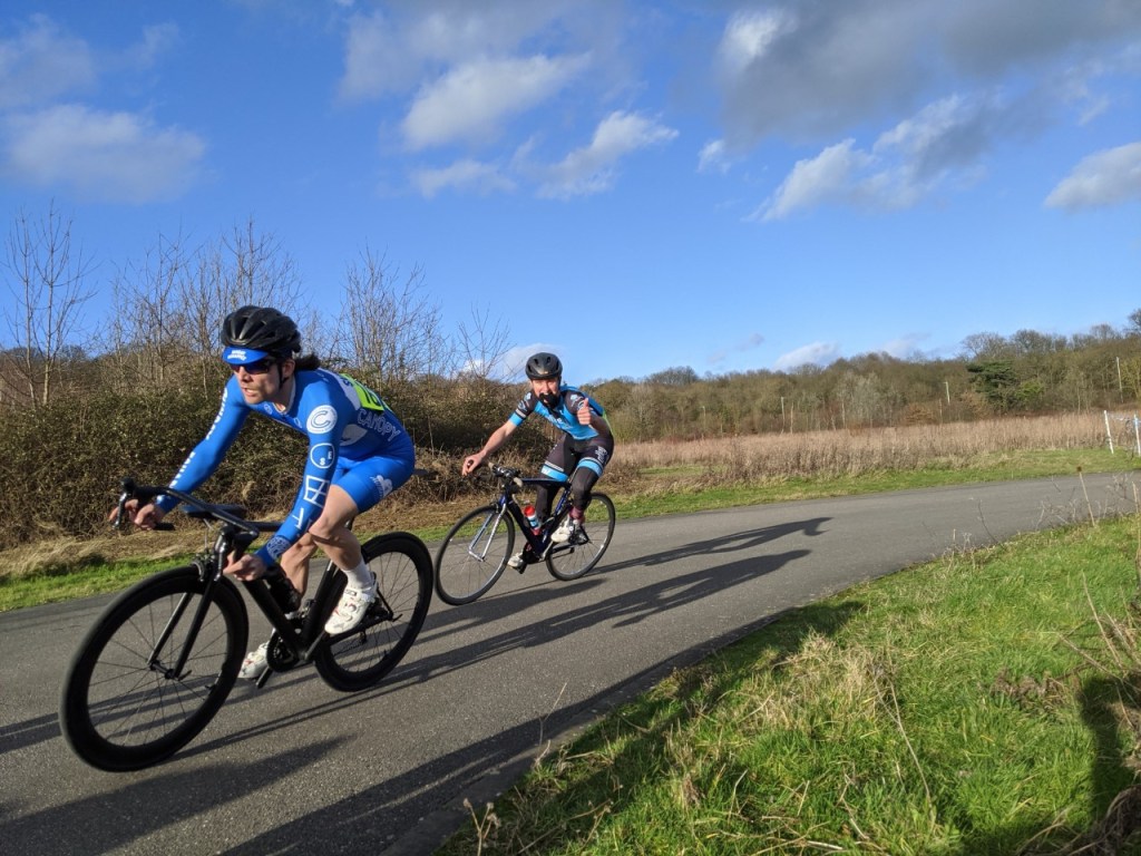 After 30 minutes Jonathan McCann (unaffiliated) and James Brown (G!ro Race Team) – winner of last week’s race so clearly had a good winter – forged a gap, while the bunch was losing riders from the back with each lap.