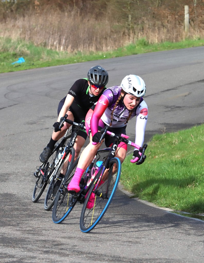 Four became three as the race wore on, with Ffion James taking the win, Connie Hayes second and Greta Cowen, third. Kitty Dennis held on solo between the groups to finish fourth.