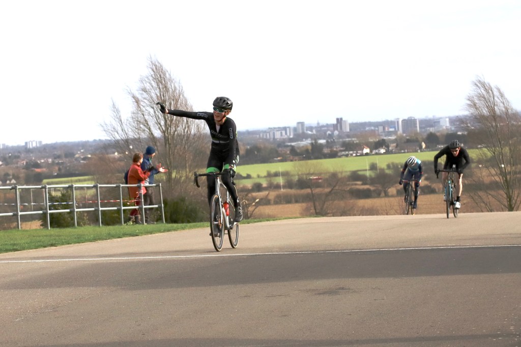 Ascending into a hurricane seldom delivers a bunch sprint finish and so it proved today – Paul Burton (Paceline RT) took a decisive win, followed by Tom Cullen (Otley CC) in second place, and Christopher Poole (London Dynamo) in third. The remaining breakaway riders – Taylor Johnstone (Velo Schils – Interbike RT), Aaron Freeman (Chelmer CC) and Colin Peck (Athlon CC) – crossed the line in that order with East London Velo’s Callum Stewart, Steve Messenger and Pete Dyson finishing with the bunch.